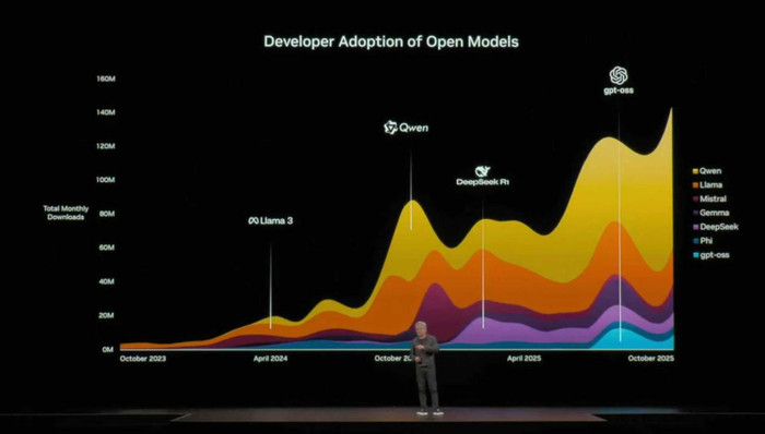 2025GTC大会,黄仁勋展示:2025年以来阿里千问Qwen已占据开源模型大部分市场份额,并且领先优势还在持续扩大中。