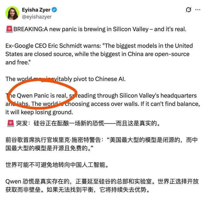 为此,硅谷甚至悄然在流行一个词“千问恐慌”(Qwenpanic)。但这更多是从技术竞争、成本竞争的角度去刻画科技的你追我赶以及美国企业界的危机感,与年初的DeepSeek带来的技术风暴相仿,与国家安全没有任何关系。