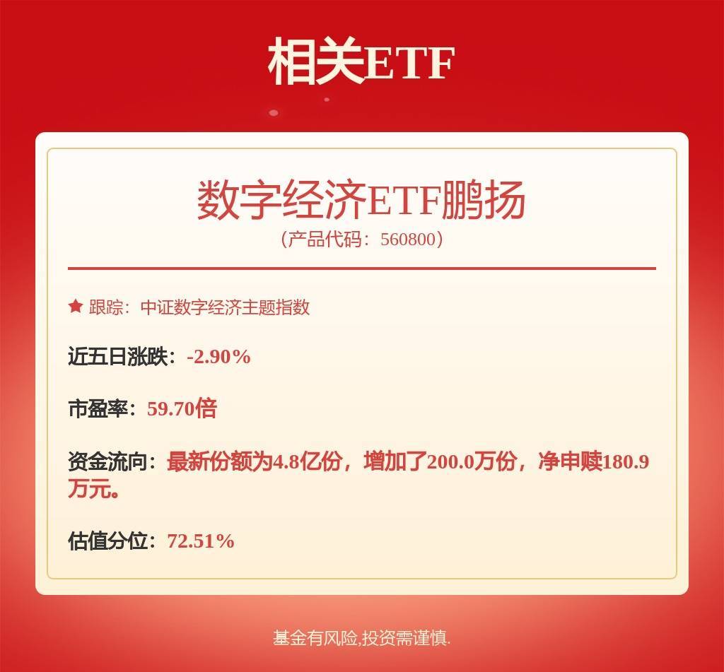 风险提示:中证数字经济主题指数(931582)由中证指数有限公司(“中证”)编制和计算,其所有权归属中证及/或其指定的第三方。中证对于标的指数的实时性、准确性、完整性和特殊目的的适用性不作任何明示或暗示的担保,不因标的指数的任何延迟、缺失或错误对任何人承担责任(无论是否存在过失)。中证对于跟踪标的指数的产品不作任何担保、背书、销售或推广,中证不承担与此相关的任何责任。