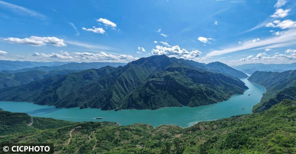 ↑2026年4月16日在重庆市巫山县拍摄的长江三峡巫峡段景色。(无人机全景照片)CICPHOTO/谭昌藩 摄