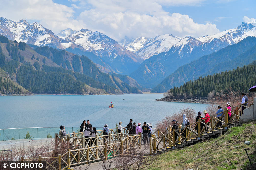 ↑2026年4月28日,游客在新疆昌吉回族自治州阜康市天山天池景区游玩。CICPHOTO/陶维明 摄