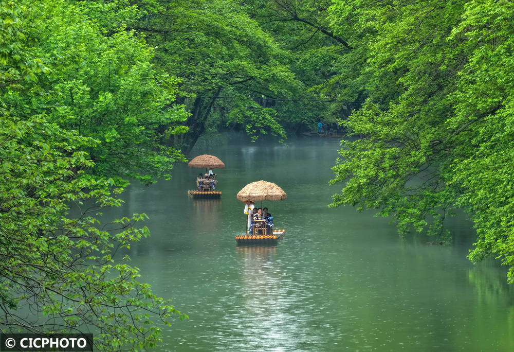 ↑2026年4月11日,在安徽省黄山市徽州区西溪南村,游客乘坐竹筏观赏丰乐河两岸的枫杨林美景。(无人机照片)CICPHOTO/施亚磊 摄编辑:马兰