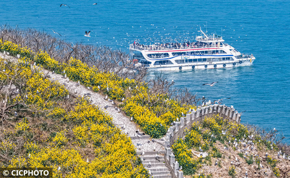 ↑2026年4月15日,游客乘坐游轮在山东省荣成市海驴岛海域游玩。(无人机照片)CICPHOTO/李信君 摄