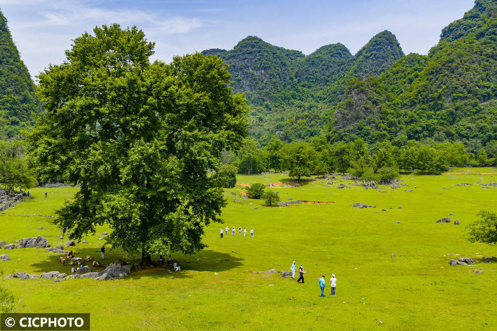 ↑2026年4月26日,游客在广西柳州市柳城县太平镇上油村拉建草原游玩。(无人机照片)CICPHOTO/黄胜林 摄