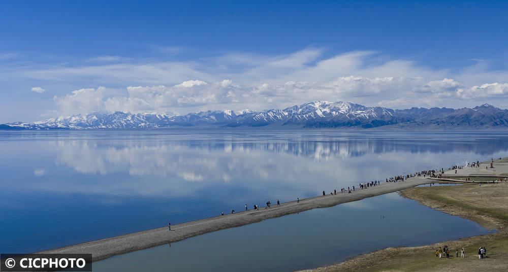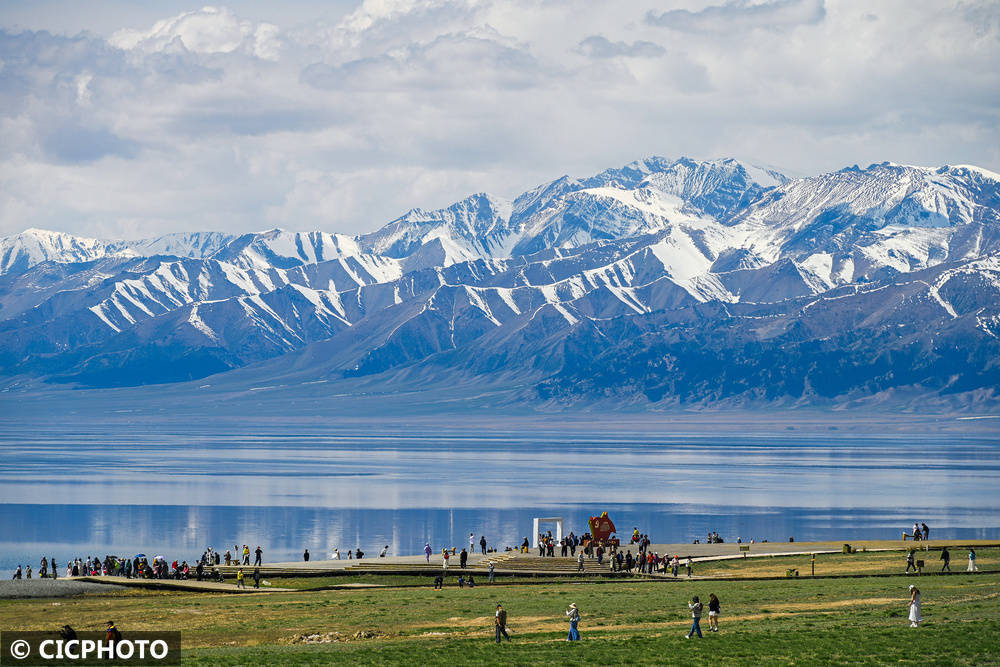 ↑2026年4月27日,游客在新疆博尔塔拉蒙古自治州赛里木湖景区游玩。CICPHOTO/韩峻 摄