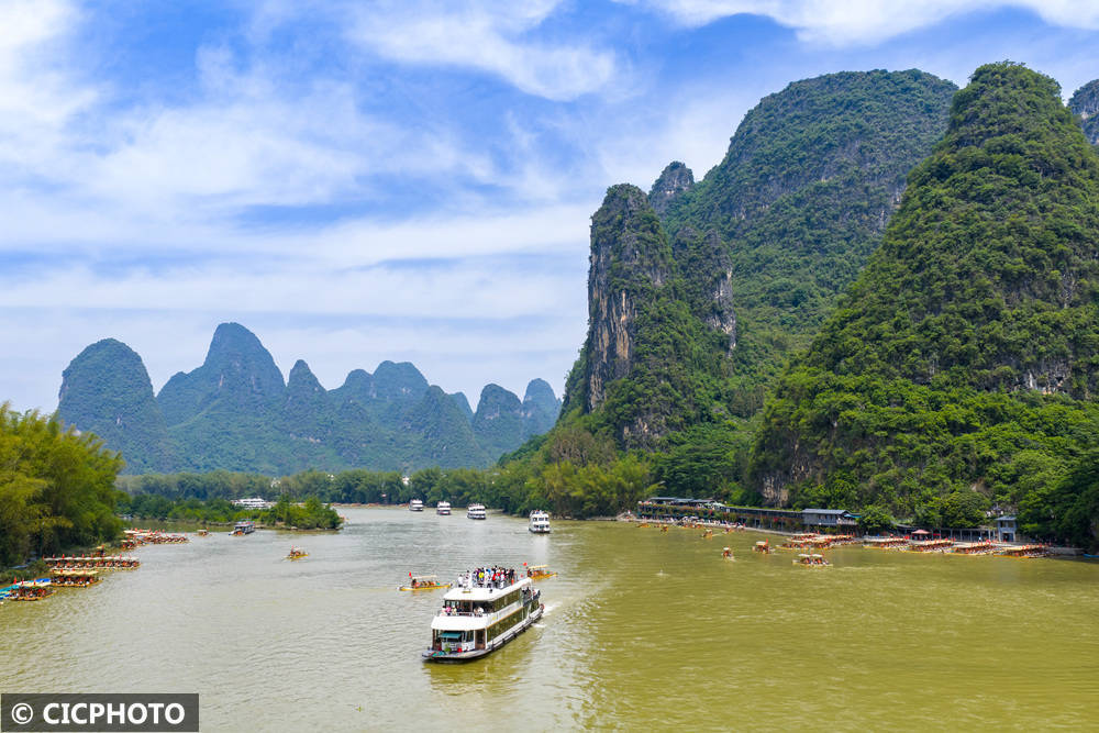 ↑2026年4月25日,在漓江广西桂林市阳朔县兴坪镇段,游客乘船、竹筏观光。(无人机照片)CICPHOTO/黄胜林 摄