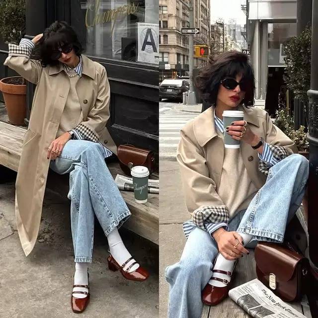 咱们就看上面这两套穿搭示范,蓝色牛仔直筒阔腿裤配上黑色玛丽珍鞋,叠穿蓝衬衫和黑 T 恤,外搭卡其色风衣,呈现效果慵懒随性。