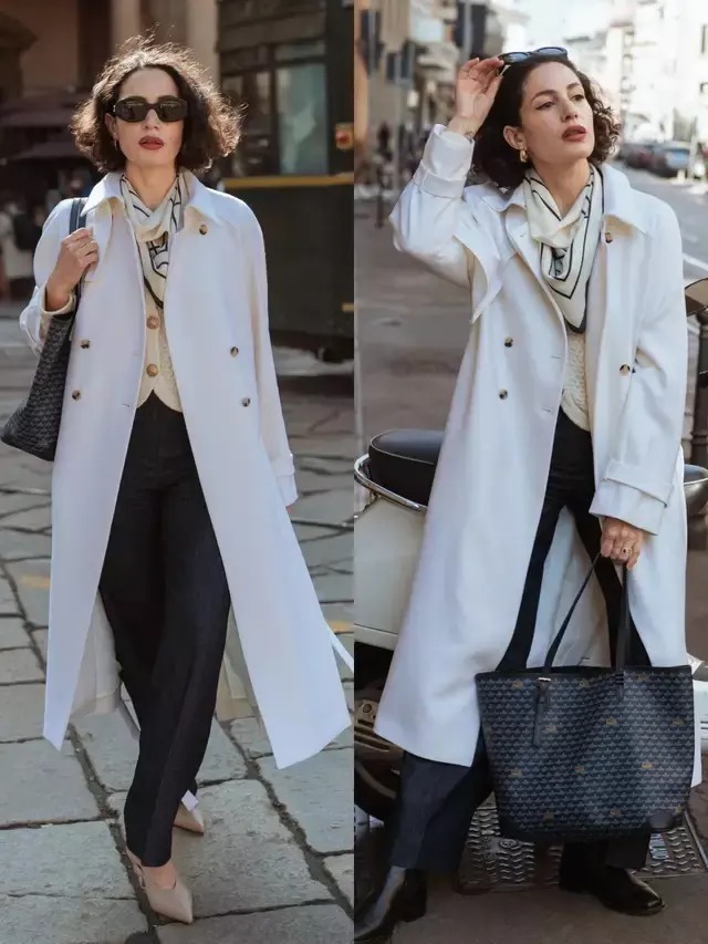 不妨选择轻量羊毛或是羊绒混纺白色长款风衣,搭配鹅黄色的针织开衫和一条黑色的直筒西裤,脚踩一双浅口皮质单鞋,瞬间提升整体的个性与张力。
