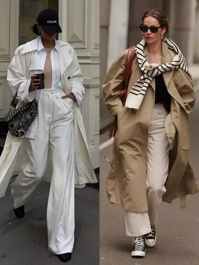 Tips③:卡其色风衣+白色直筒阔腿裤