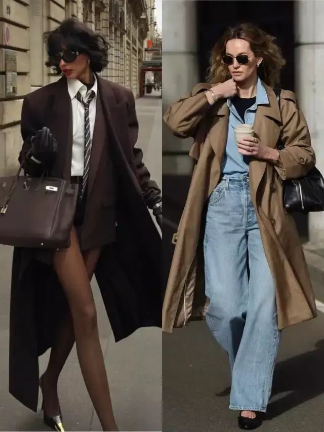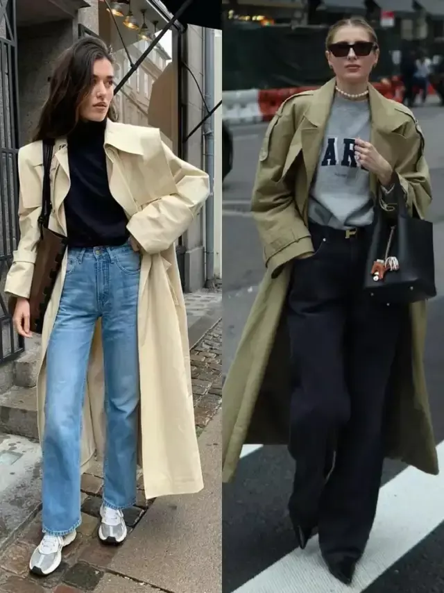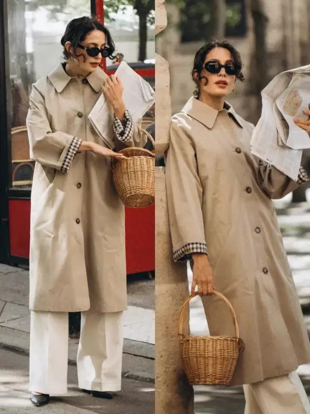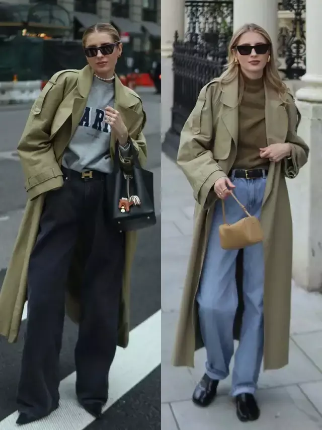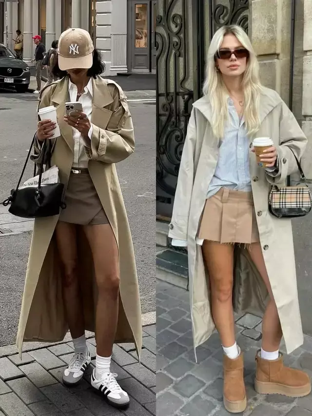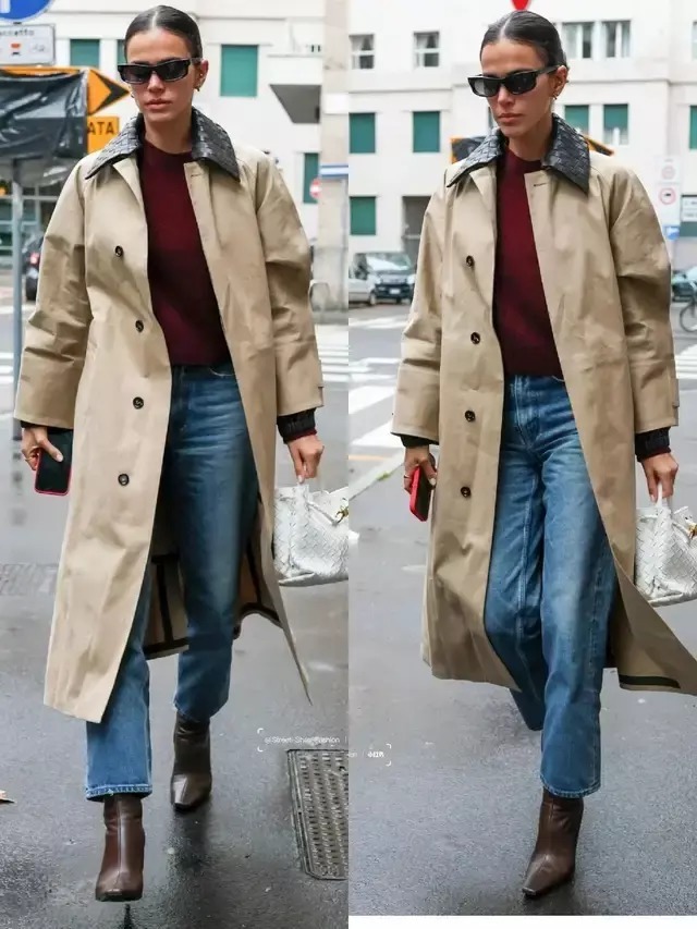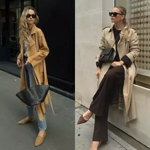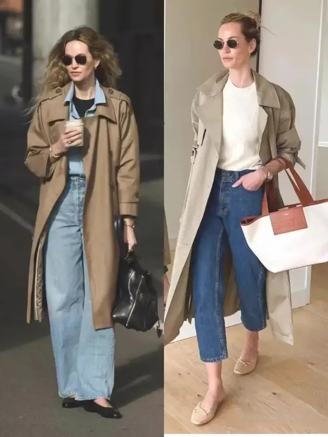 风衣的款式版型很相近,但造型的气质却藏在穿搭细节里,换成一双尖头高跟鞋,便能悄悄拉长腿部线条,利落又有气场。