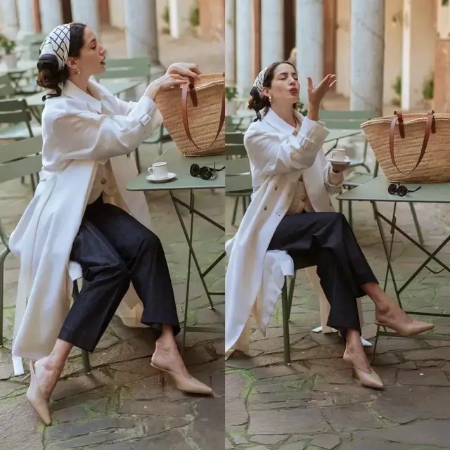 可搭配牛仔直筒裤、卡其色风衣,内搭同色针织毛衣,叠穿条纹衬衫,鞋子清爽提亮,还能与包包色彩呼应,整体温柔又显高级时尚。