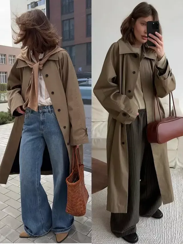 例如上面穿的同样是卡其色的风衣外套,换一条裤子便是另一种气质与风格。