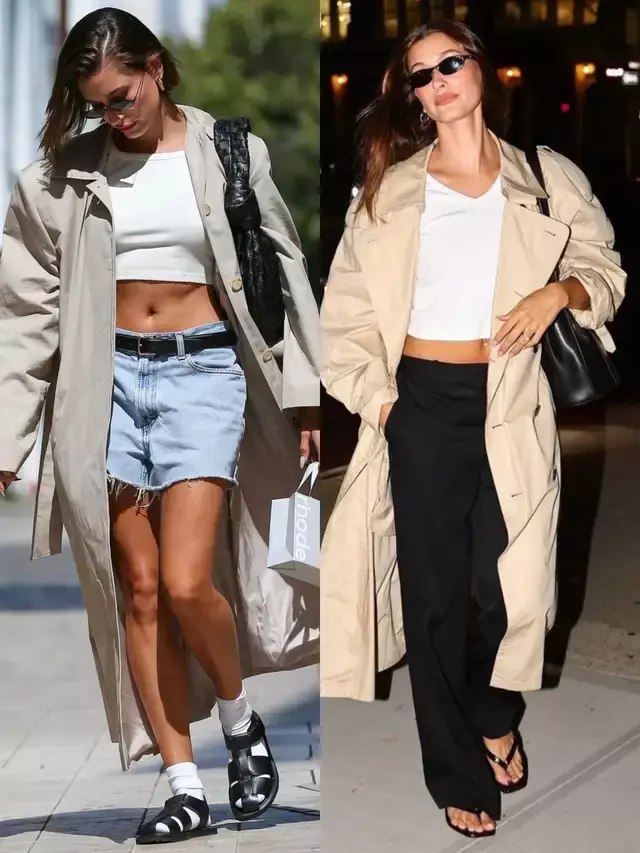 选择裤装来搭配风衣外套,要顺着自己的身形来决定。身材高挑纤瘦可穿蓝色牛仔短裤配浅卡其色风衣与白色短款背心,利用露腰让自己呈现凹凸有致身形,时尚灵动。