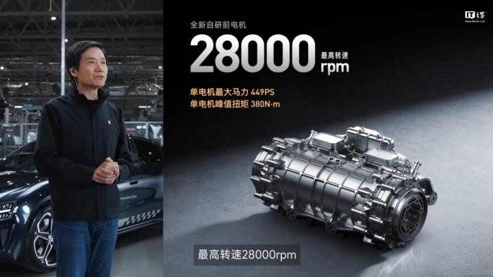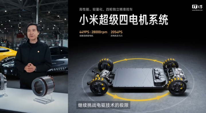小米超级四电机系统迎来升级,包括2个全新自研电机+2个V8s电机,最大马力可达2054PS。全新自研前电机最高转速可达28000rpm,单电机最大马力449PS,单电机峰值扭矩380N・m。
