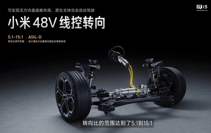 小米48V线控转向技术,可让方向盘和车轮的转向多少完全由软件控制,转向比调节范围5:1~15:1可调,可实现无方向盘座舱布局。