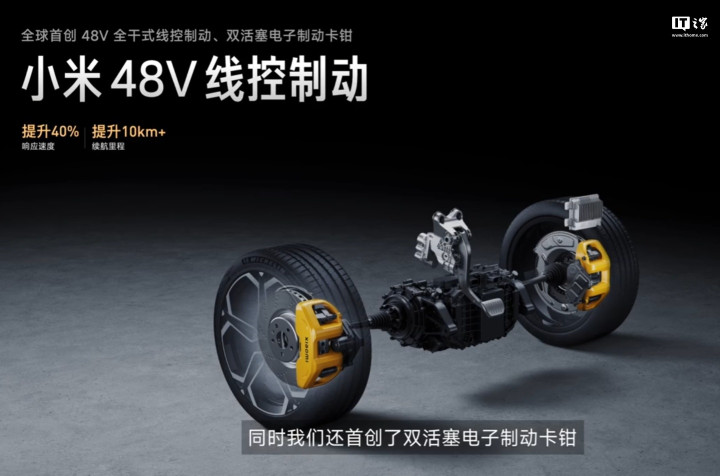小米48V线控制动取消了液压机构,使用电动卡钳来实现线控电传,无需添加刹车油。该技术使得线控制动系统响应速度提升40%,续航里程提升10公里以上。