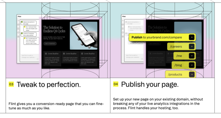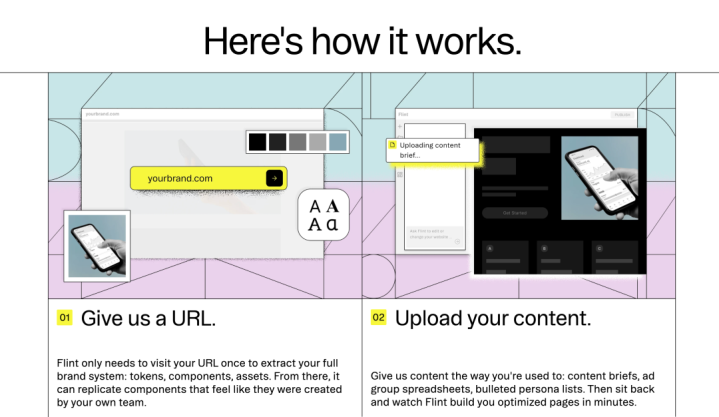 在当前阶段,Flint的工作流程相对简单但效果显著。客户上传一份内容简报和现有网站的URL,Flint会吸收他们的设计系统,然后生成完全编码的页面,这些页面可以直接部署在他们的根域名上。关键是,这些页面不是模板生成的千篇一律的内容,而是完全符合品牌视觉风格的定制页面。Flint不会”随意编码”任何东西,而是分析现有网站的外观和感觉,确保新生成的页面与现有设计保持一致。