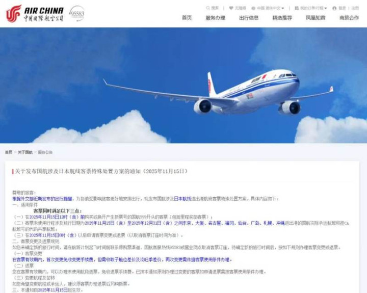 国航宣布日本航线退票免服务费。国航官网截图