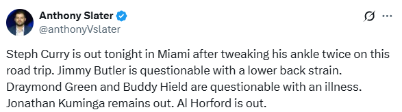 据勇士随队记者Anthony Slater报道,斯蒂芬-库里因伤缺席今天与热火的比赛,他在本次客场之旅中两次扭伤了脚踝;吉米-巴特勒因背部拉伤出战成疑。德雷蒙德-格林和巴迪-希尔德因病出战成疑。库明加继续缺阵,艾尔-霍福德继续背靠背轮休。