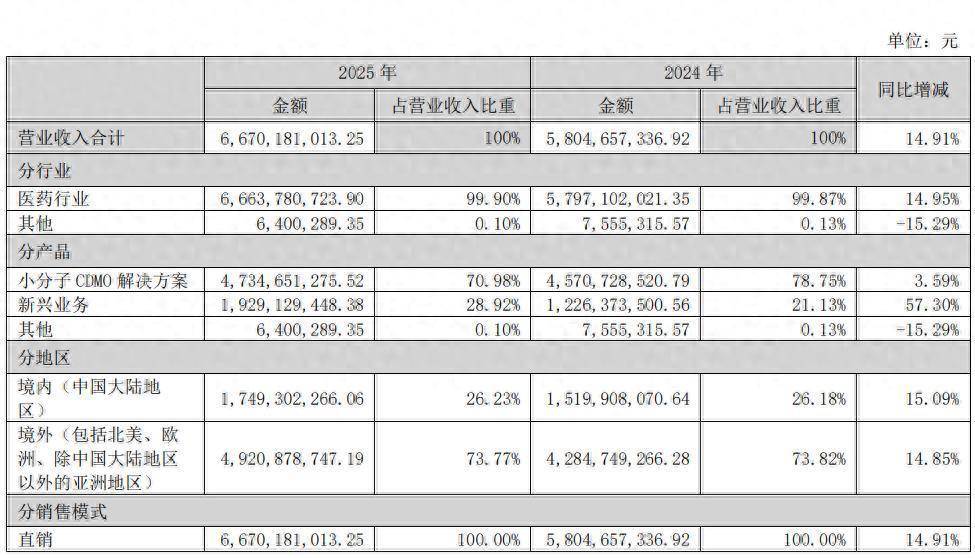 2025年,公司小分子业务实现毛利率为46.83%,同比降低1.11个百分点;新兴业务整体毛利率30.12%,同比提升8.45个百分点。分地区来看,公司境内业务毛利率为21.98%,同比增长2.07个百分点;境外业务毛利率49.11%,同比降低1.22个百分点。