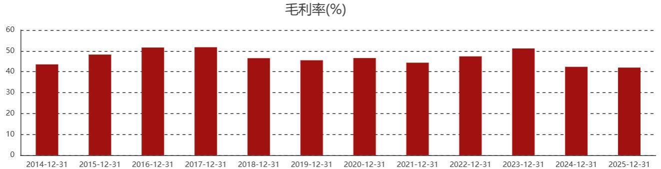 在营收和净利增长的背后,是凯莱英下行的毛利率。2025年度公司毛利率为41.99%,较上年下降0.37个百分点,创上市来新低。凯莱英2017年创下51.74%的毛利率历史峰值,此后至2023年再次突破50%大关。其余年份的毛利率水平则稳定维持在46%左右区间波动。