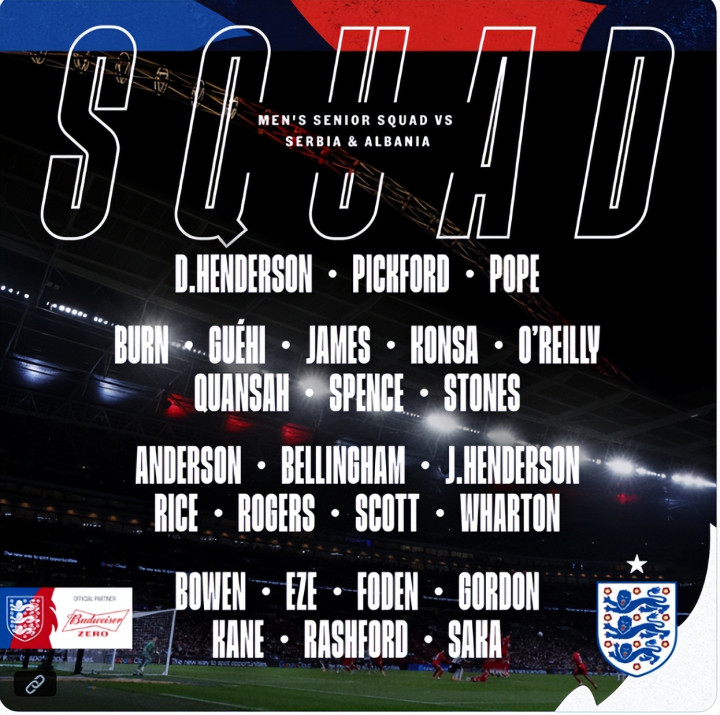 赖斯、萨卡、埃泽入选了新一期英格兰国家队。