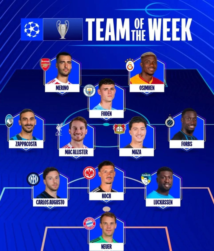 官方:梅里诺入选了本周欧冠最佳阵容。